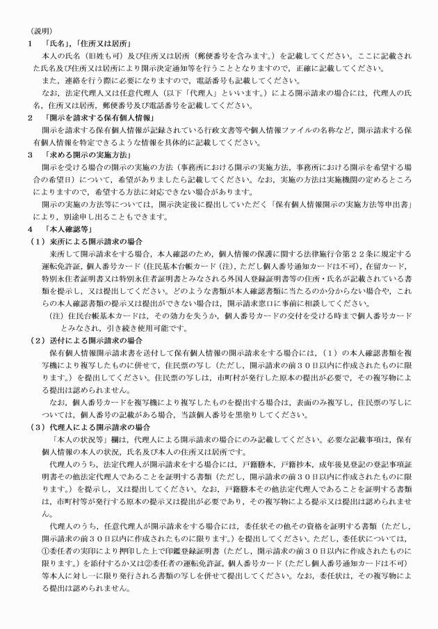 (1) 開示請求書,訂正請求書又は利用停止請求書(以下この条において「開示請求書等」という。)に記載されている開示請求をする者,訂正請求をする者又は利用停止請求をする者(以下この条において「開示請求者等」という。)の氏名及び住所又は居所と同一の氏名及び住所又は居所が記載されている運転免許証,行政手続における特定の個人を識別するための番号の利用等に関する法律第2条第7項に規定する個人番号カード,出入国管理及び難民認定法第19条の3に規定する在留カード,日本国との平和条約に基づき日本の国籍を離脱した者等の出入国管理に関する特例法第7条第1項に規定する特別永住者証明書その他法律又はこれに基づく命令の規定により交付された書類であって,当該開示請求者等が本人であることを確認するに足りるもの